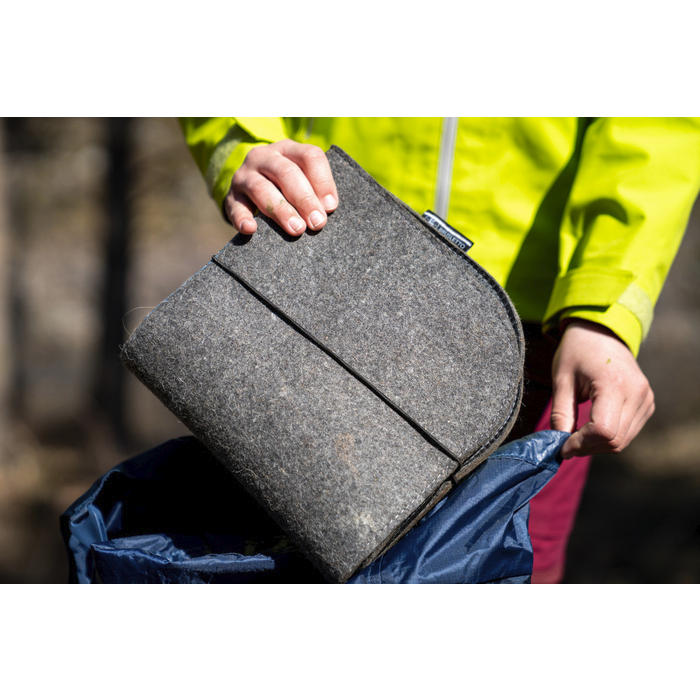 Sammenleggbart sitteunderlag som er perfekt å ta med seg på tur. Sitteunderlaget har en strikk som gjør at sitteunderlaget brettes slik at størrelsen blir ¼ av opprinnelig størrelse. På undersiden av sitteunderlaget er det et lag med vannavvisende polyester som gjør at sitteunderlaget ikke blir vått, selv om underlaget er vått. Marka sitteunderlaget er laget i 100% tovet ull. Dersom du får flekker anbefaler vi at du bruker en våt klut for å fjerne dem.