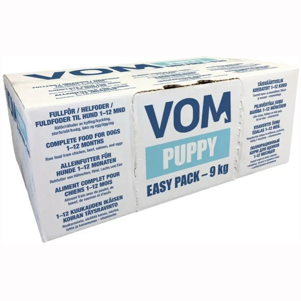 Easy Pack PUPPY Fullfôr.Valpen er fra naturens side tilpasset en kjøttbasert diett. PUPPY består av kjøtt, skinn og bein fra kylling, storfevom, laks, kokte egg og storfelever, i tillegg tilsettes vitamin- og mineralpremix. Blandingen gir valpen en naturlig og god start på et langt og sunt hundeliv. Hver kartong inneholder 9kg med hundemat.