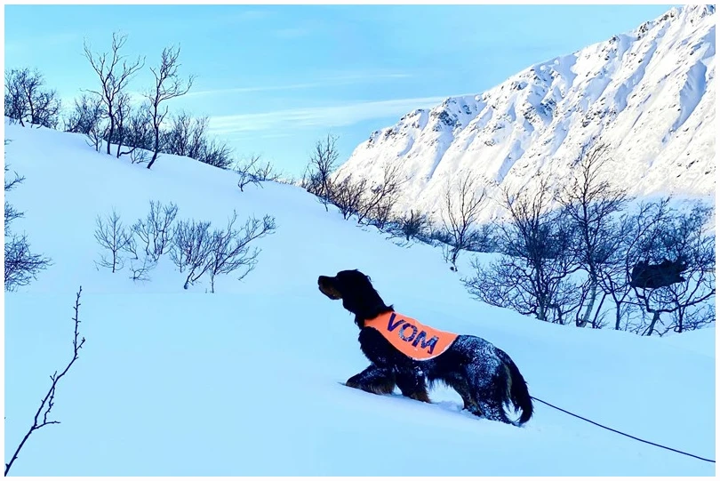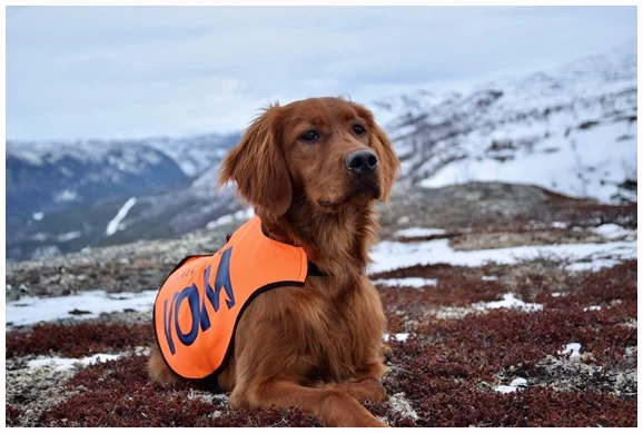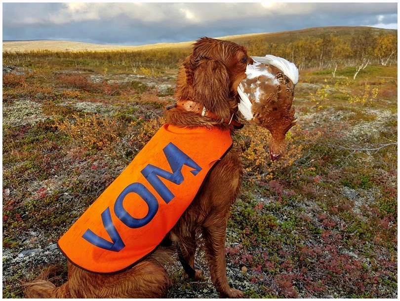 Yukon jaktdekken / markeringdekken er et tosidig dekken med en oransje og en gul side. Den oransje siden har blå påtrykket VOM logo på hver side. Gjør hunden godt synlig i terrenget.