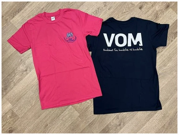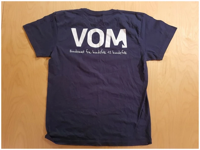 VOM T-skjorte i 3 forskjellige farger. Blå og Rosa har Vom og Hundemat logoen på brystet, mens den oransje har VOM logoen.