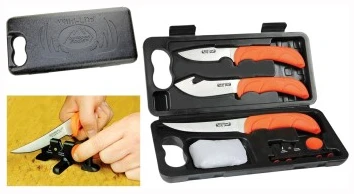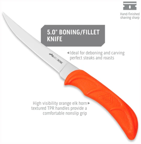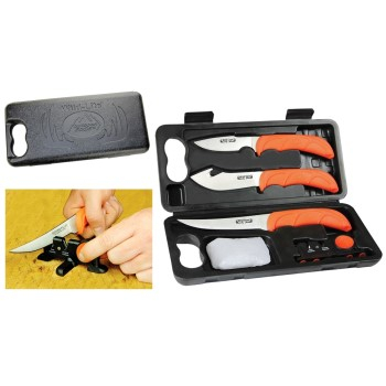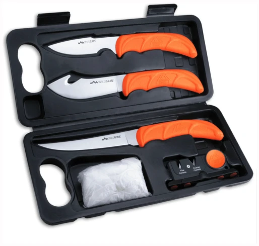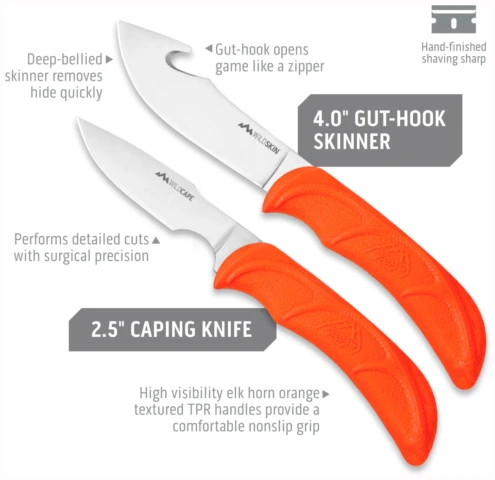 Vårt letteste og mest kompakte knivsett med hard bæreveske er perfekt for bruk i felten og hjemmeforedling. Med en vekt på bare 50 gram inkluderer dette komplette 6-delers settet en full-tang-kniv, en flåkniv for innvoller, en utbenings-/filetkniv, viltrensehansker og en totrinns keramisk/karbid-sliper for å opprettholde en barberkant til enhver tid. Bladene i rustfritt stål 420J2 er presist varmebehandlet og håndbehandlet som barbering. Gummiert, flammeoransje TPR-håndtak gir høy synlighet i felten og sikrer et sklisikkert grep, selv når de er våte. I tillegg gir elghorninnlegget ekstra indekseringspunkter for bedre kontroll og forhindrer tretthet under langvarig bruk. Sikre kjøttkvaliteten for familien din og spar kostnadene ved kommersiell foredling med WildLite.
